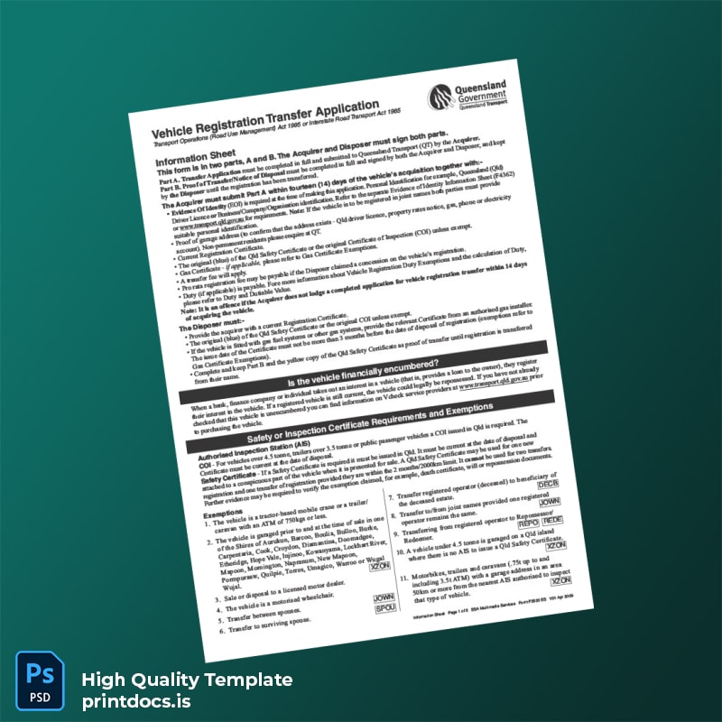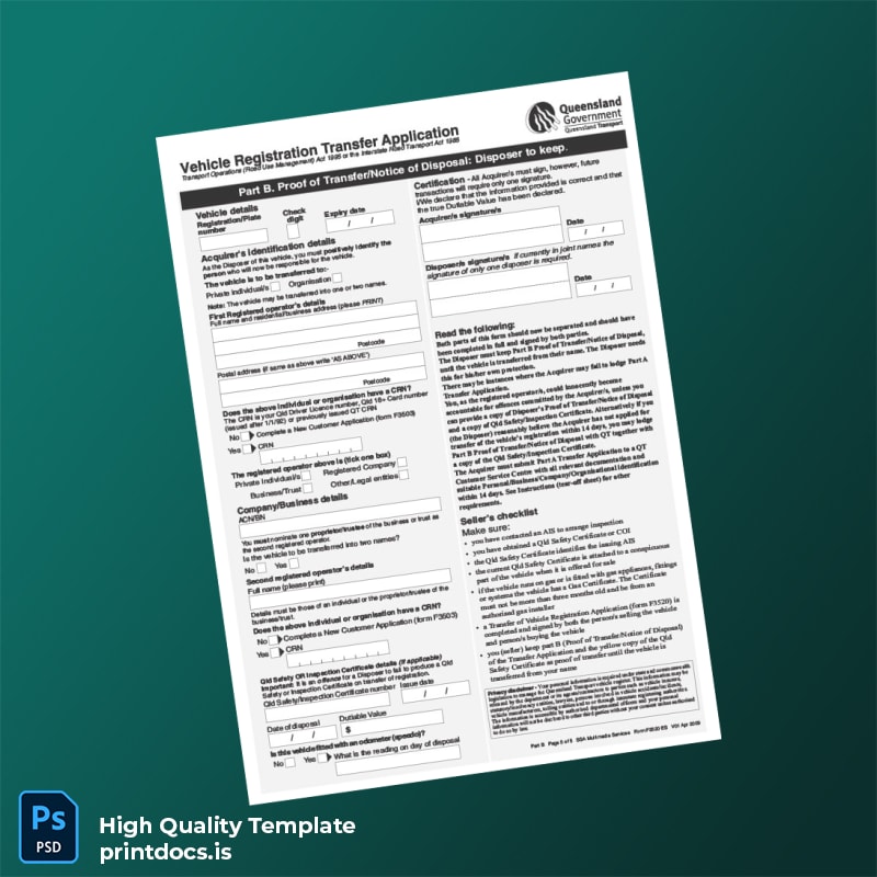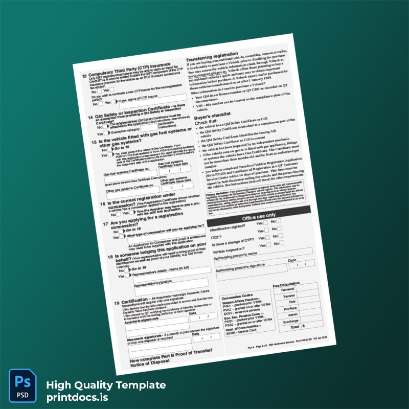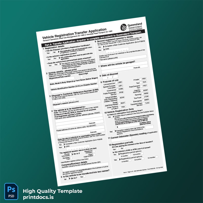 Printable Australia Queensland Vehicle Registration Transfer Application Word and PDF Template—editable and print-ready for fast, professional vehicle registration transfers.