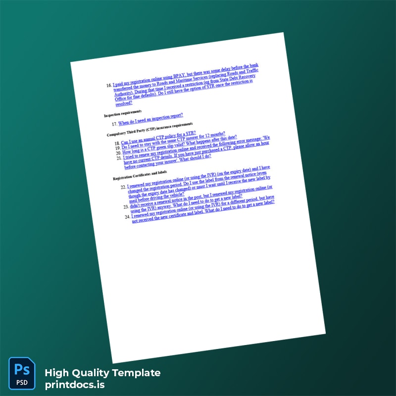 Experience the convenience of the Australia Roads and Maritime Services Short Term Registration Certificate Template, a fully editable and printable Word and PDF document designed for professionals who need quick and accurate replacements or modifications of their registration certificates. This template offers a seamless way to recreate your essential paperwork without the usual delays or complications.