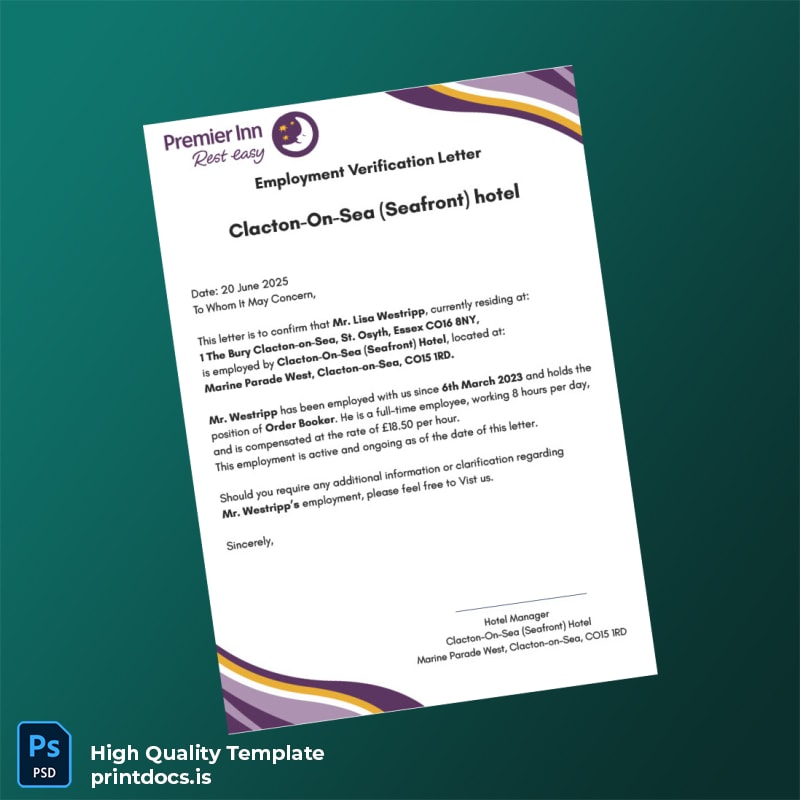 Experience the ease of crafting a polished employment verification letter tailored to your organization’s specifications. Purchase the Clacton-On-Sea Seafront Hotel Employment Verification Letter template now and enjoy swift, professional results with editable convenience and print-ready precision at your fingertips.