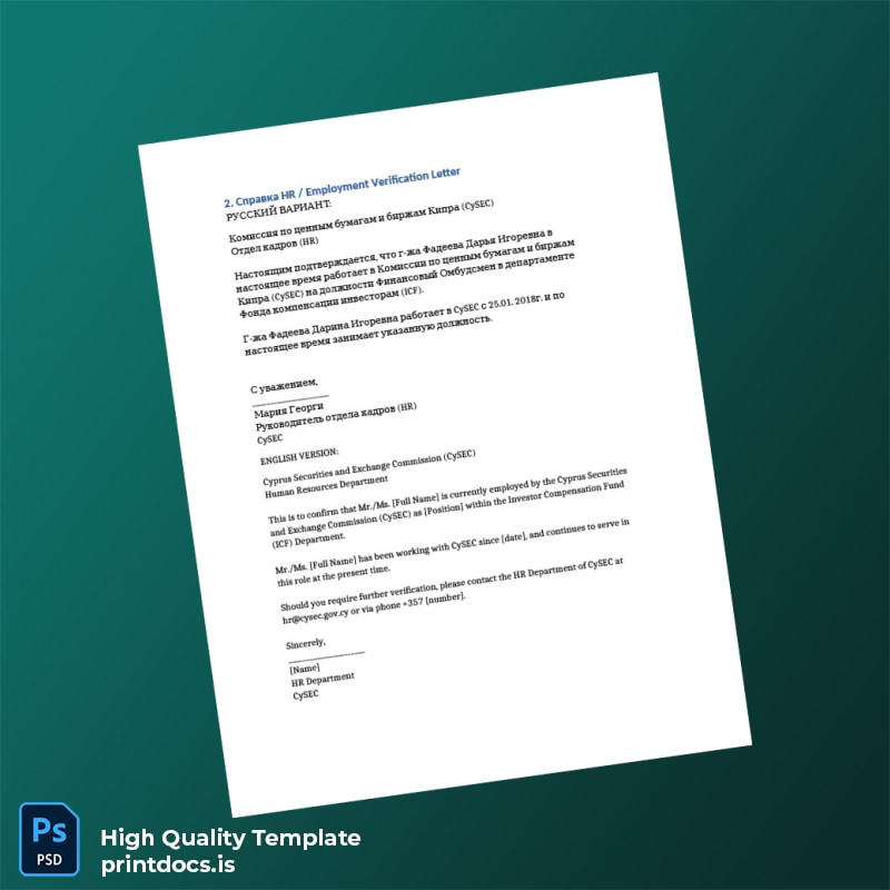 Don’t let delays or uncertainty hamper your professional documentation. With this editable and printable Cyprus Fund for Investor Compensation ICF Employment Verification Letter template, you equip yourself with a dependable resource tailored for your verification requirements. Purchase now to enjoy seamless editing, immediate download, and a polished final document that meets professional standards.