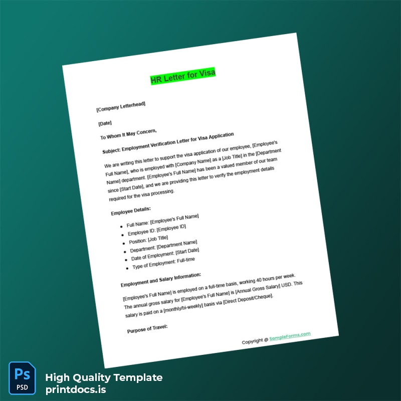 Our Employment Verification for Visa Letter Template (Word & PDF) is designed to help HR professionals, administrative staff, and employees quickly generate a formal proof of employment document that meets global visa requirements. Whether you need to confirm job status for visa applications, loan approvals, or legal formalities, this editable and printable template supports your professional documentation needs efficiently.