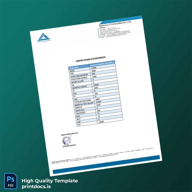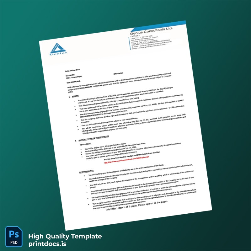Streamline your professional documentation with the Printable Genius Consultants Ltd Employment Verification Letter Word and PDF Template. Editable and print-ready, our template empowers you to produce clean, accurate, and official employment confirmation letters effortlessly. Download now and experience convenience and professionalism combined in one reliable tool.