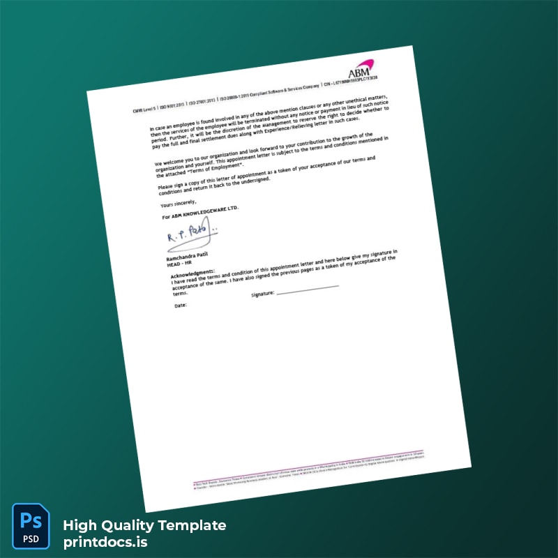 Be the first to review “Printable India ABM Knowledgeware Ltd Employment Verification Letter Template (Word & PDF) 5 page”