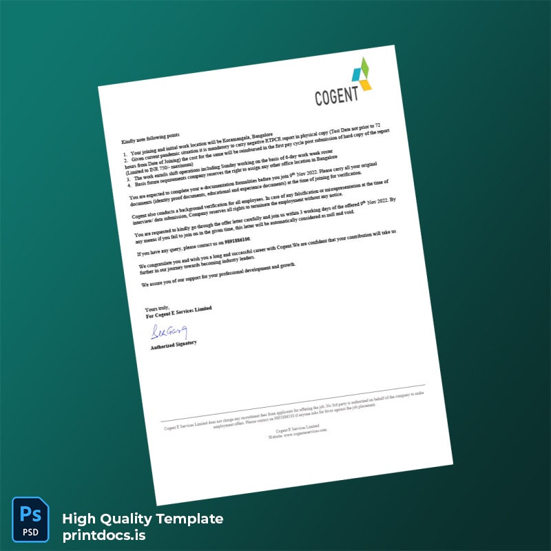 Don’t let paperwork hold you back. Download the India Cogent E Services Limited Employment Verification Letter Template now and enjoy a streamlined, customizable, and professional approach to certification of employment. Make document management effortless and ensure your proof of employment meets all professional standards.