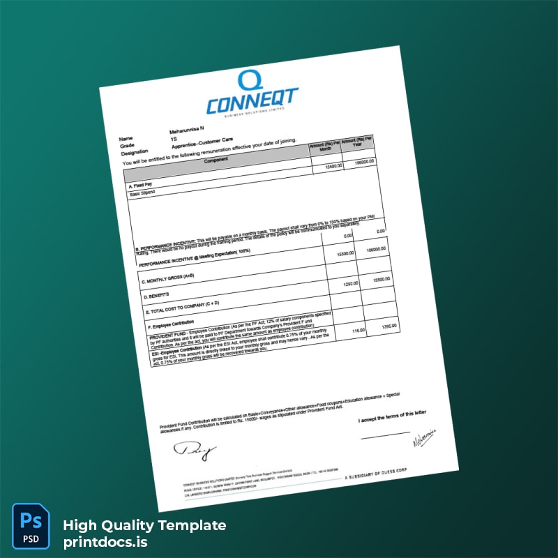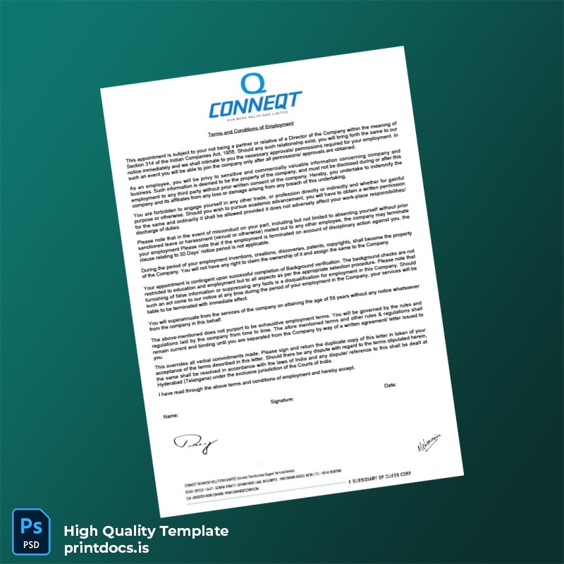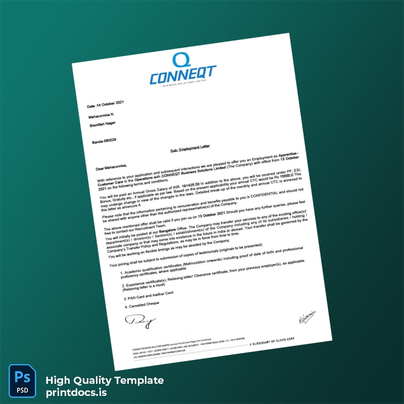 Don’t let complicated or delayed documentation slow your workflow. Choose the Printable India CONNEQT Business Solutions Limited Placement Letter Word and PDF Template to deliver editable, printable, and professional employment proof effortlessly. Enhance your HR communications now by securing your template and experience a seamless verification process that meets international professional standards.