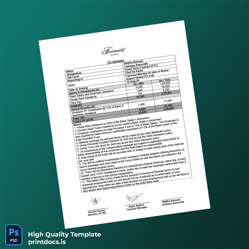 Printable India Fairmont Mumbai Employment Verification Letter Template (Word & PDF)