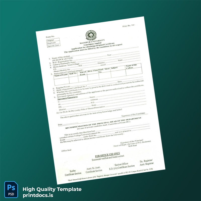 Effortlessly create a professional, authentic-looking original certificate for India Manipur University with this fully editable and printable Word and PDF template. Designed for administrative staff, educators, and educational institutions, this template streamlines the process of certificate issuance, ensuring accuracy and consistency while saving valuable time.