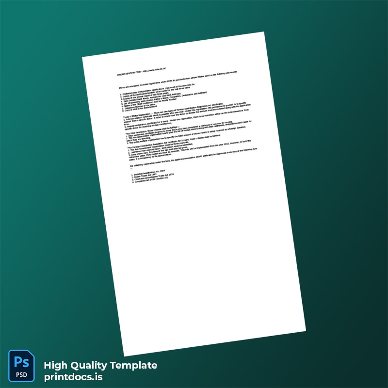 This Printable India Ministry of Home Affairs FCRA Registration Certificate Word and PDF Template offers a seamless and professional solution for organizations requiring an accurate and editable registration certificate. Designed specifically to meet official standards, this template caters to professionals who need a dependable and efficient way to recreate or update their FCRA registration documentation.