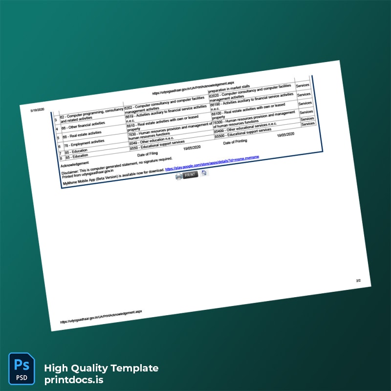 Unlock a seamless way to update and print your India Ministry of Micro Small and Medium Enterprises Udyog Aadhaar Registration Certificate with our fully editable Word and PDF template. Designed for entrepreneurs, business owners, and administrative professionals, this certificate template enables you to quickly adjust vital details such as company name, address, registration number, and dates, ensuring your documentation is accurate and professional.