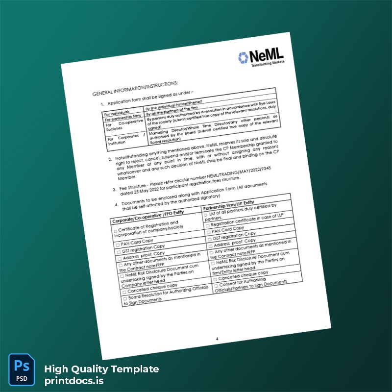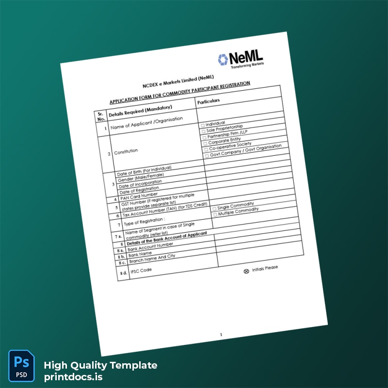 Don’t let outdated or missing registration forms slow down your business. Download the India NCDEX e Markets Limited Commodity Participant Registration Form Template today and experience the confidence of a perfectly editable and print-ready certificate template crafted for real-world business needs.