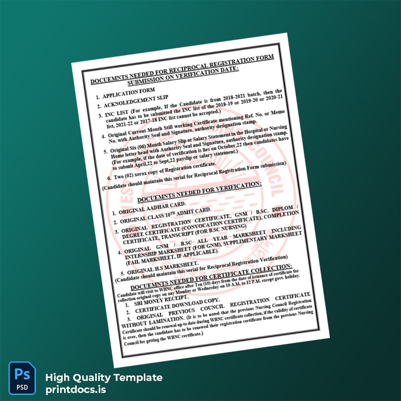 Printable India Nursing Council Registration Certificate Word and PDF Template