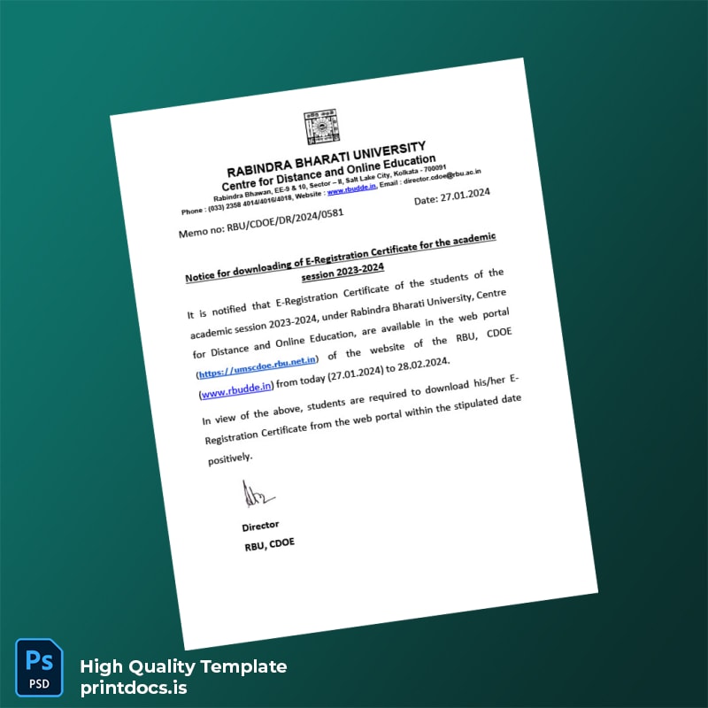 Printable India Rabindra Bharati University E Registration Certificate Template (Word & PDF)