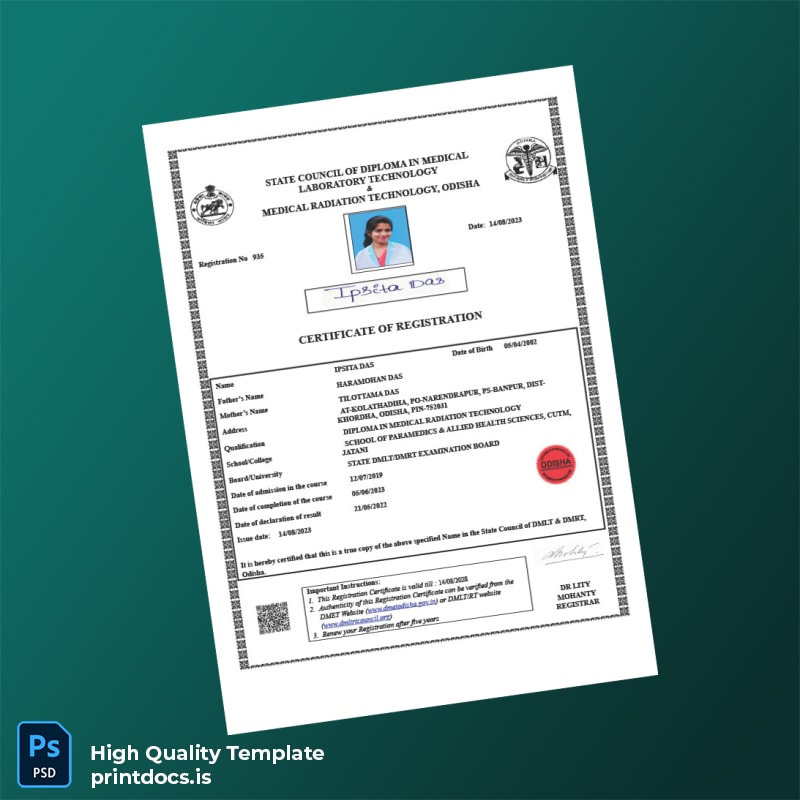 Streamline Your Registration Process with the India State DMLT_DMRT Examination Board Registration Certificate Template