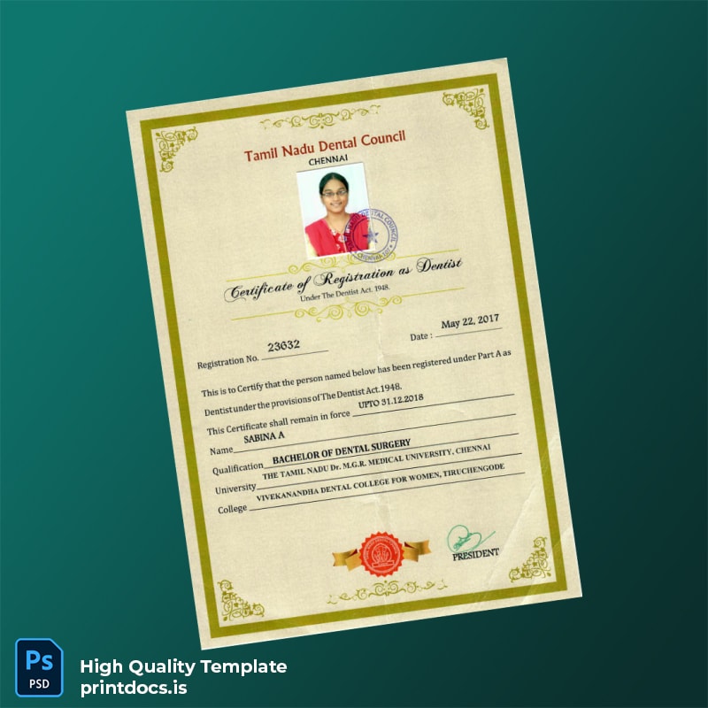 Editable and Professional India Tamil Nadu Dental Council Certificate Template