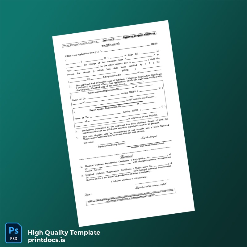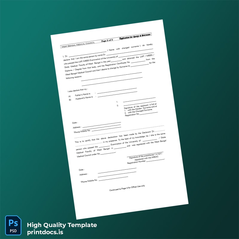 Managing official documentation can be a daunting task, especially when it involves sensitive changes like updating your surname with the India West Bengal Medical Council. Our India West Bengal Medical Council Application for Change of Surname Template in Word and PDF formats is meticulously crafted to simplify this process for medical professionals and administrators who demand efficiency and accuracy. This editable template enables seamless updating of personal details, ensuring your application meets official standards without the usual hassle.