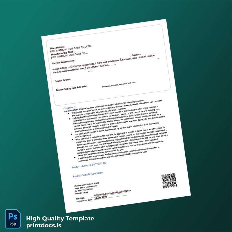 Managing official documentation for medical devices can be complex and time-consuming. The Kenya Pharmacy and Poisons Board Medical Device Registration Certificate Template (Word & PDF) is designed to simplify your registration process with an editable, professional certificate template that saves you time and stress.