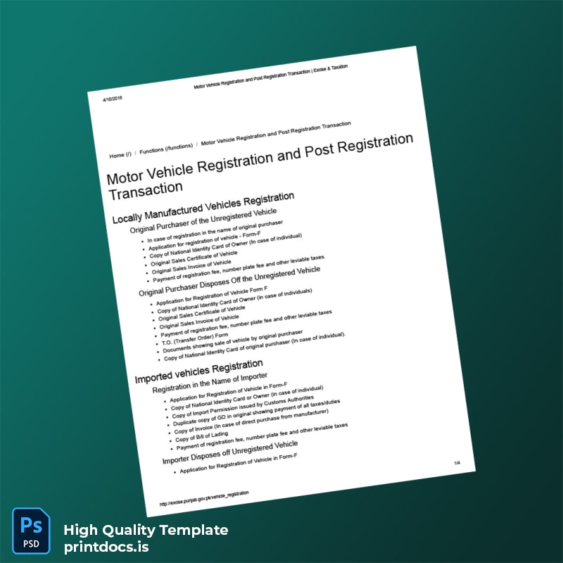 Don’t let misplaced or outdated vehicle registration papers disrupt your professional or personal schedules. Invest in the Pakistan Excise and Taxation Authority Motor Vehicle Registration Certificate Template (Word and PDF) today and enjoy the confidence of handling your vehicle documentation with ease, accuracy, and speed.
