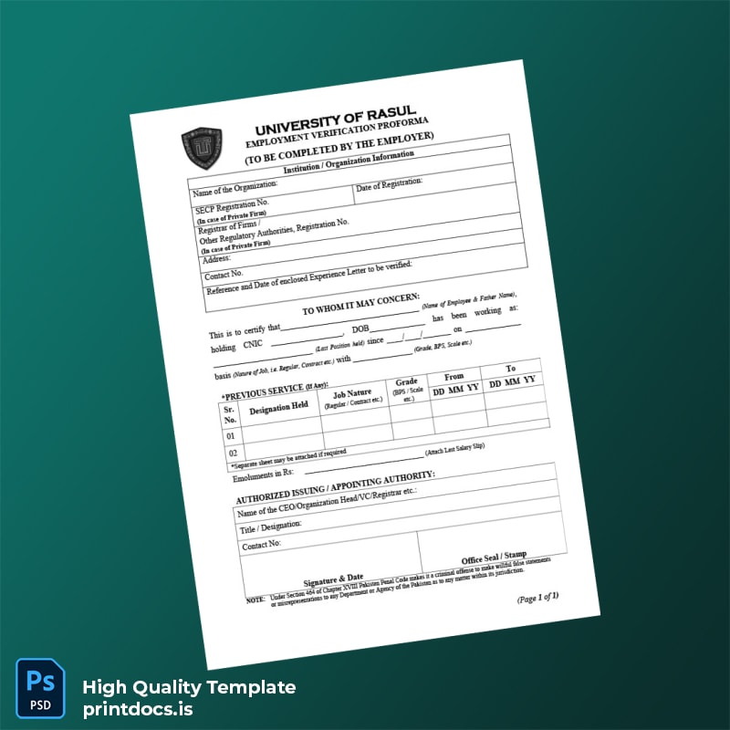 Don’t let paperwork slow down your professional processes. Invest in the Printable Pakistan University of Rasul Employment Verification Proforma Template (Word & PDF) to gain a reliable, editable, and print-ready instrument that elevates your document management and compliance. Secure your copy now and simplify your employment verifications with confidence.