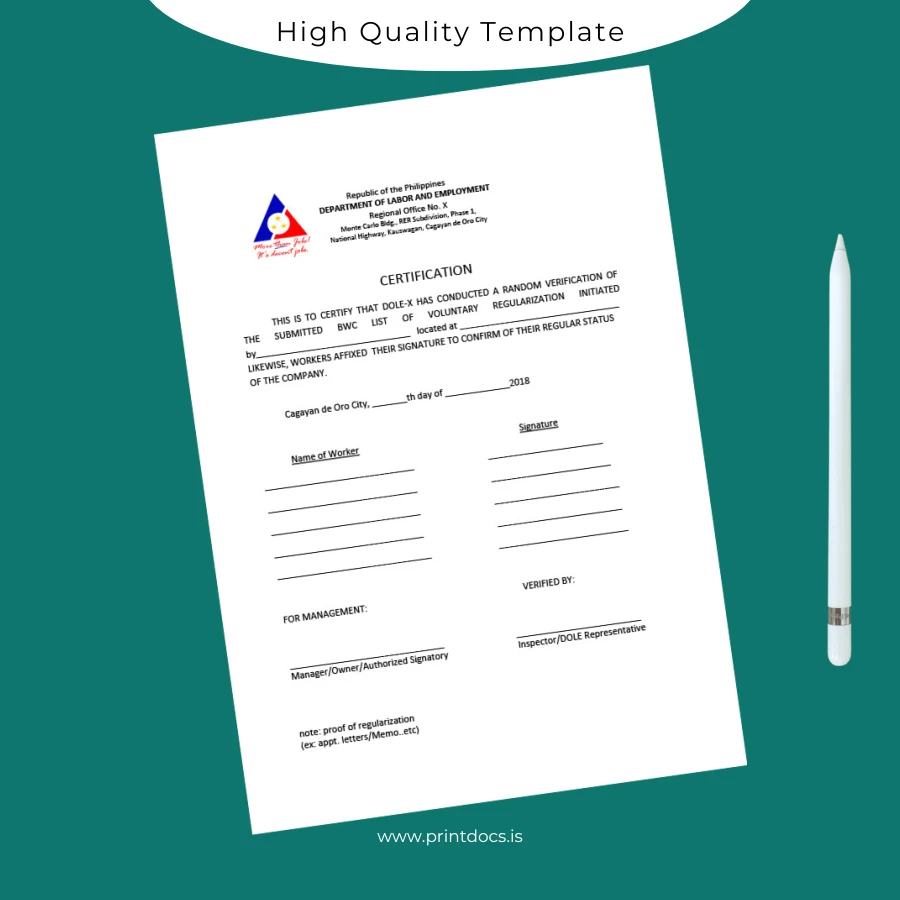 Secure a hassle-free and professional method for issuing employment verification letters with this editable and printable template. Streamline your workflow, ensure accuracy, and maintain compliance effortlessly. Purchase the Printable Philippines Department of Labor and Employment Employment Verification Letter Template today and experience the difference a well-crafted document can make for your business and employees.