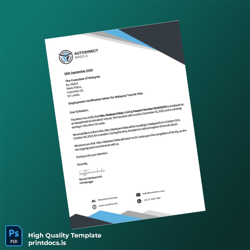 Save time and reduce stress with an editable, print-ready employment verification letter that fits your professional demands. Click to download the Printable Sri Lanka Autodirect Wheels Employment Verification Letter Template in Word and PDF formats today, and ensure your employment credentials are always ready when you need them most.