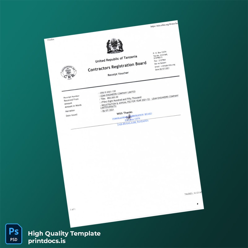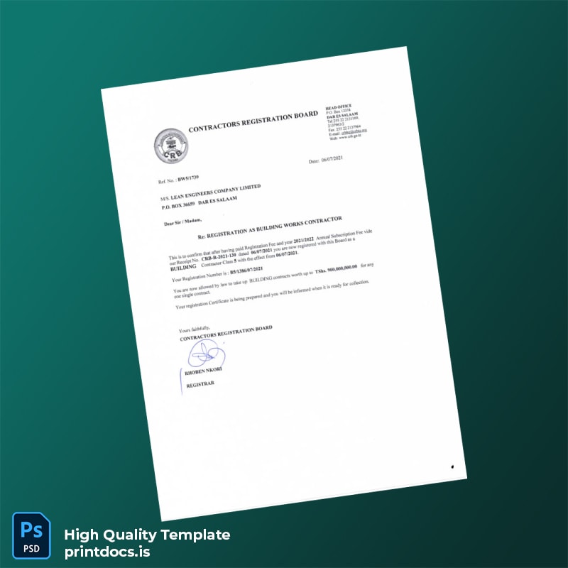 Editable Tanzania Contractors Registration Board Business Registration Certificate Template