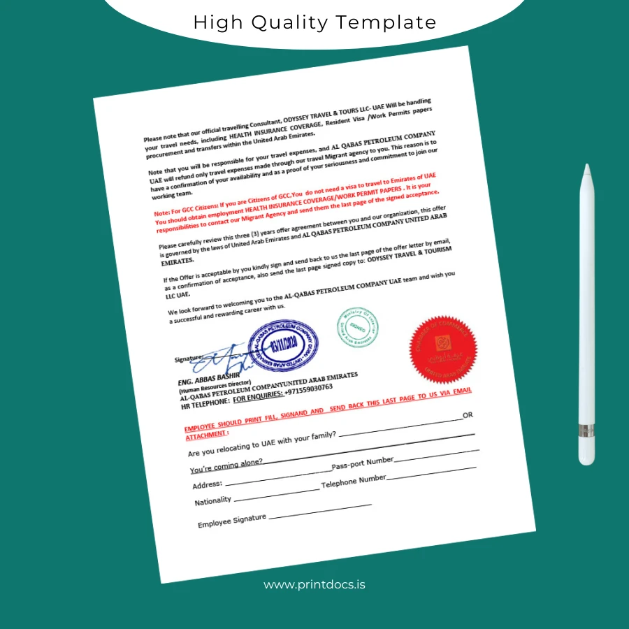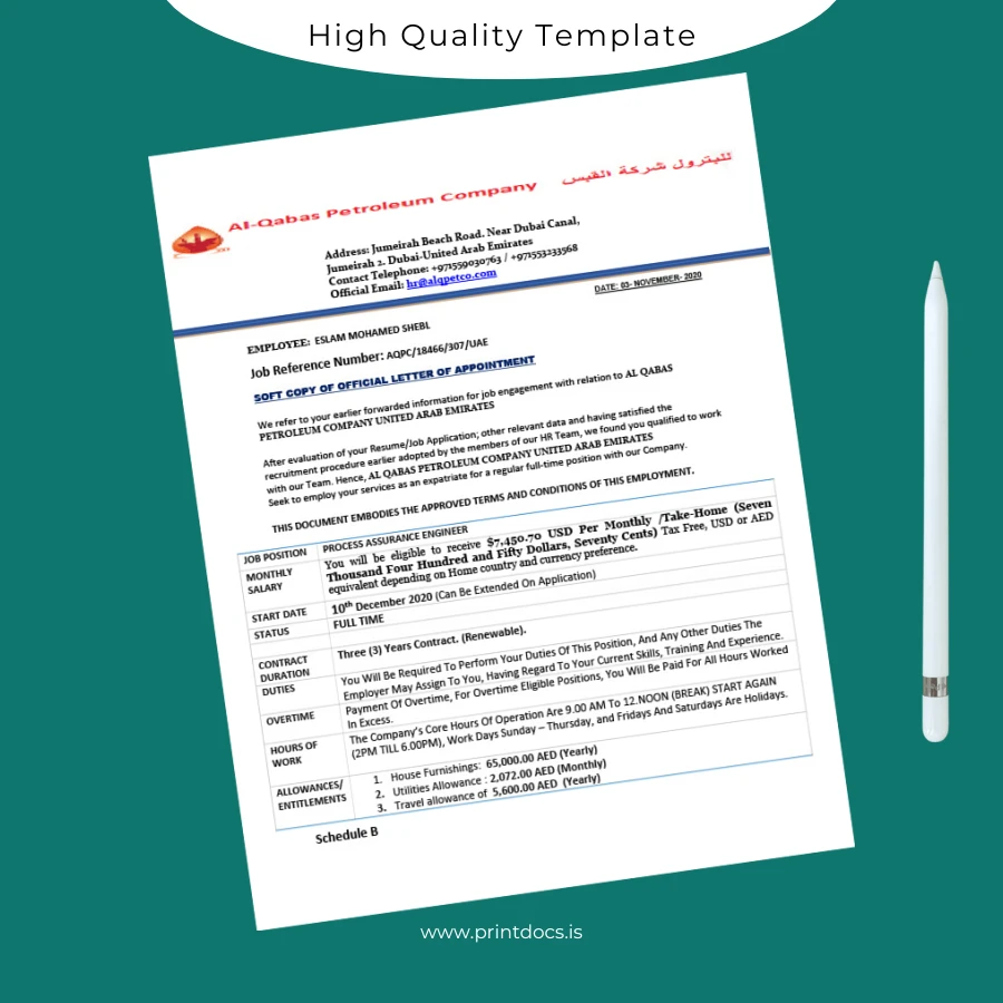 United Arab Emirates Al Qabas Petroleum Company Employment Verification Letter Template (Word & PDF)