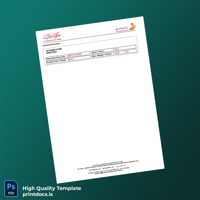 The United Arab Emirates Dubai Municipality Consumer Products Registration Certificate Template in Word & PDF formats is your ideal solution for quick, hassle-free documentation. Designed specifically for businesses requiring precise, editable registration certificates, this template streamlines the process of creating compliant, professional-grade certificates in minimal time.