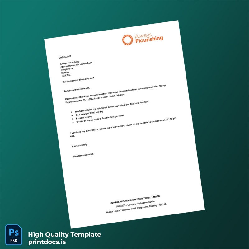 Printable United Kingdom Always Flourishing Employment Verification Letter Template (Word & PDF)