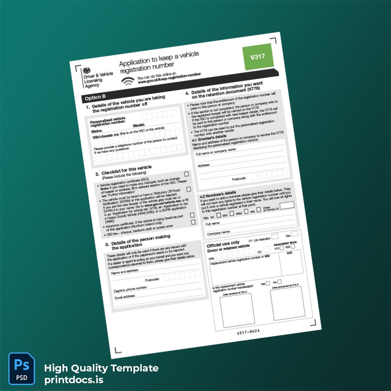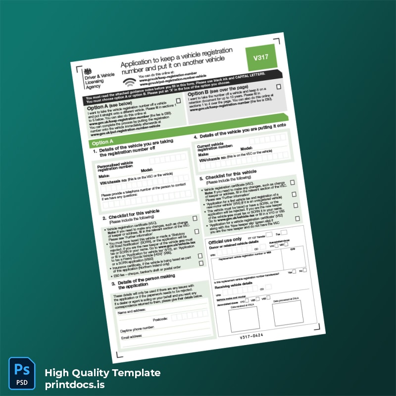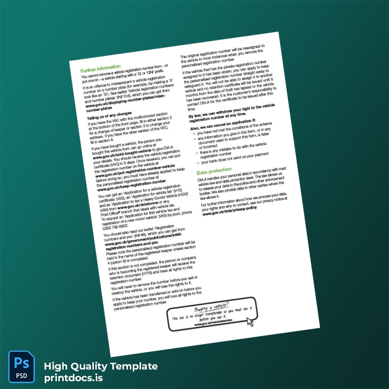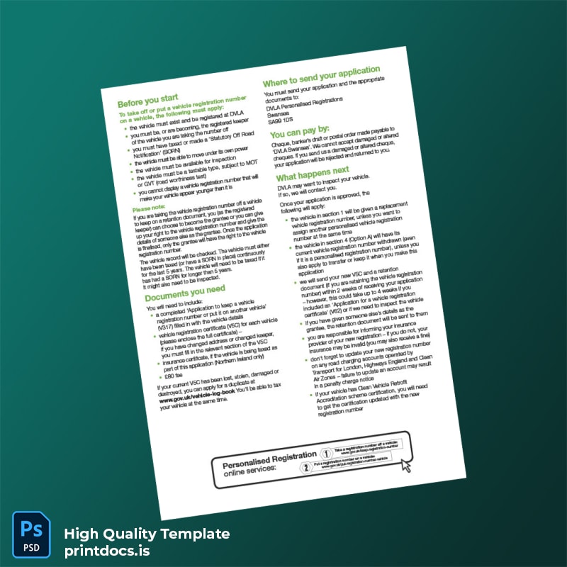 The United Kingdom DVLA Vehicle Registration Number Transfer Application Form Template in Word and PDF formats is designed for professionals who require a fast, editable, and print-ready solution for transferring vehicle registration numbers. This versatile certificate template Word file enables you to efficiently handle registrations while maintaining accuracy and compliance with DVLA regulations.