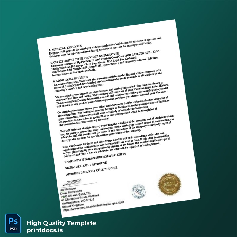 Printable United Kingdom PWC Oil and Gas Ltd Employment Verification Letter Template (Word & PDF) 2 page