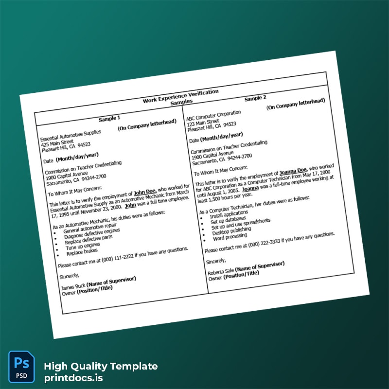 Ready to simplify your work experience verification process? Download the editable and printable United States Work Experience Verification Letter Template today and create professional, tailored employment letters instantly. Ensure accuracy, save time, and maintain a polished corporate image with this indispensable resource.