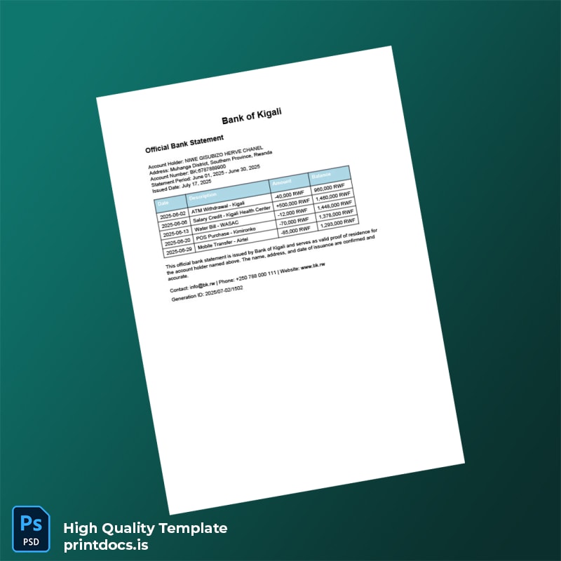 Don’t let administrative delays hinder your progress. Empower yourself with the Rwanda Bank of Kigali Official Bank Statement Template and streamline your documentation process. Ready to take the next step? Click to explore related products such as editable bank statement template in Word and discover even more options. Experience the ease of creating professional documents with our templates now!