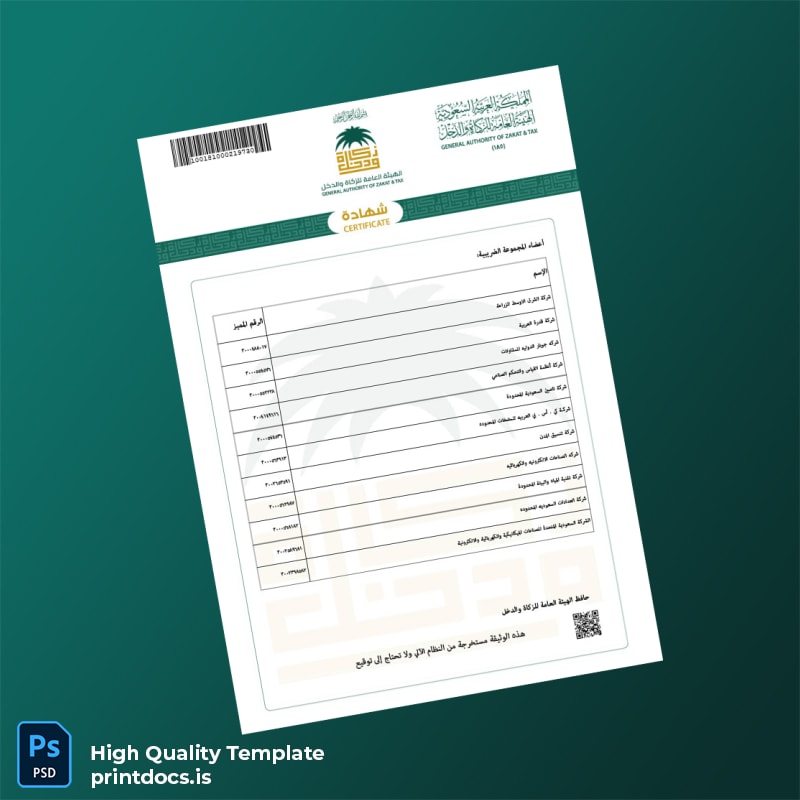 Saudi Arabia General Authority of Zakat and Tax VAT Group Registration Certificate Template (Word & PDF)