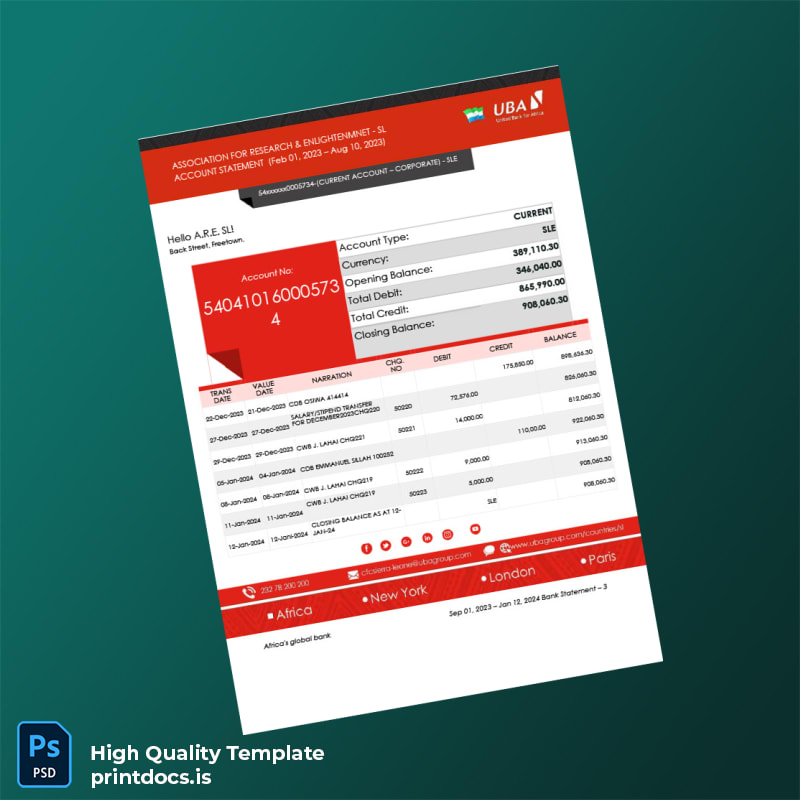 In today’s fast-paced world, losing or needing a bank statement on short notice can be a daunting task. The Sierra Leone Africa’s Global Bank Statement Template empowers professionals by providing a reliable and editable solution for both Word and PDF formats.