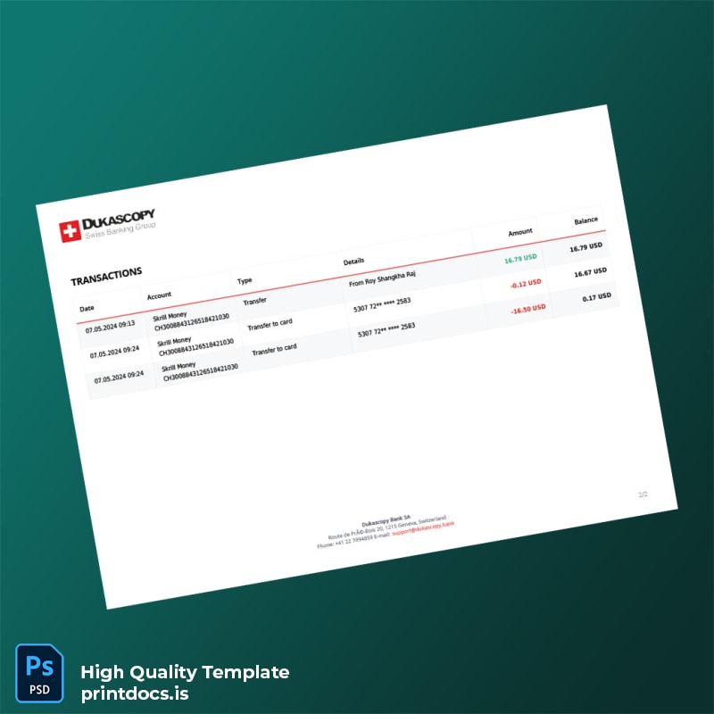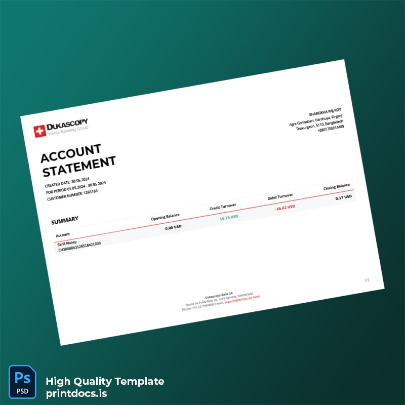 Obtain an authentic-looking bank statement in moments with our Switzerland Dukascopy Bank Statement Template. Designed for creative and technical professionals, this editable template ensures you never face delays due to missing documents. Whether you need a quick replacement or additional statements, our template serves as the perfect solution.