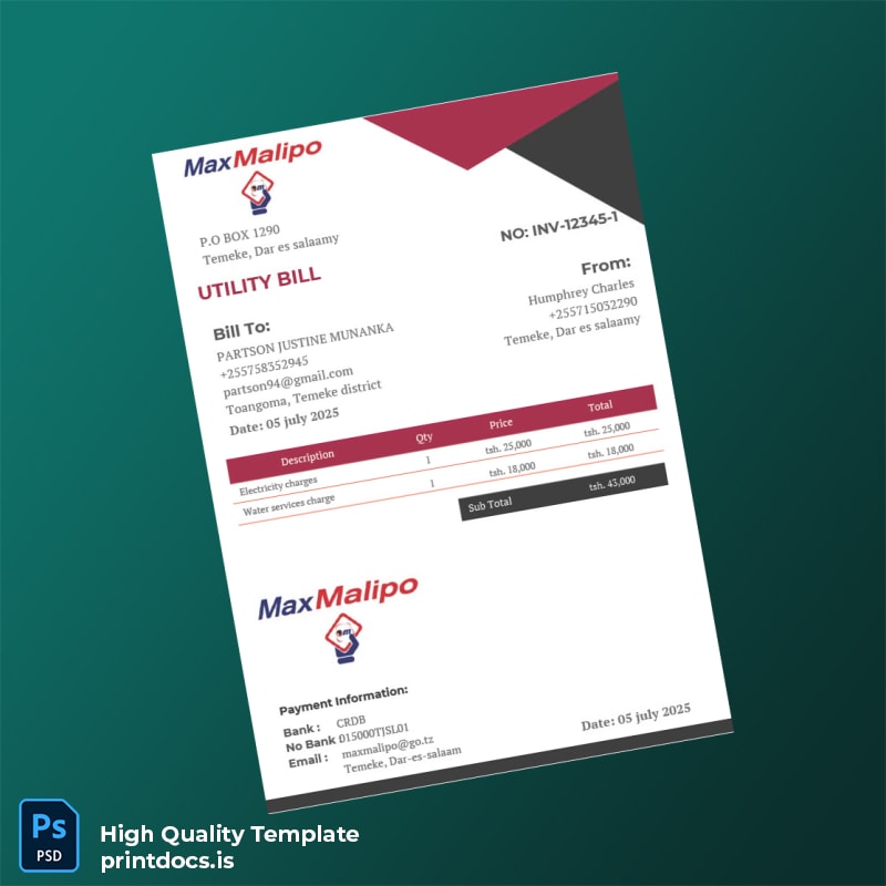 Reliable Tanzania Humphrey Charles Editable Utility Bill Template in Word and PDF Formats