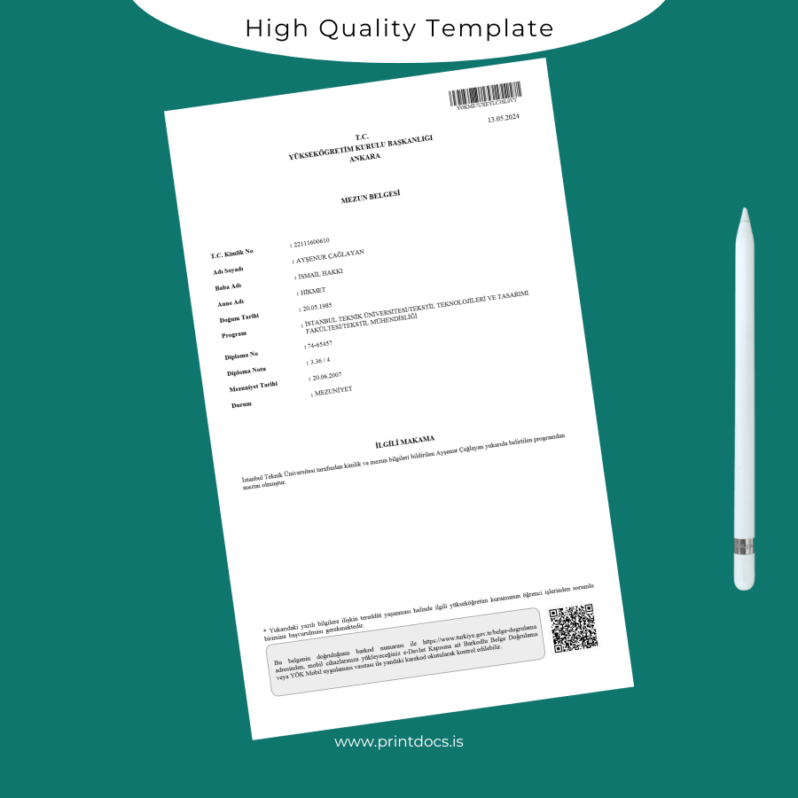 Don’t let missing or outdated diplomas disrupt your professional progress. Download this customizable degree template now to access a clean, editable design that you can personalize effortlessly and print at your convenience. Enhance your credential management with a reliable solution tailored specifically for Turkey Istanbul Technical University Bachelor of Science in Textile Engineering graduates.