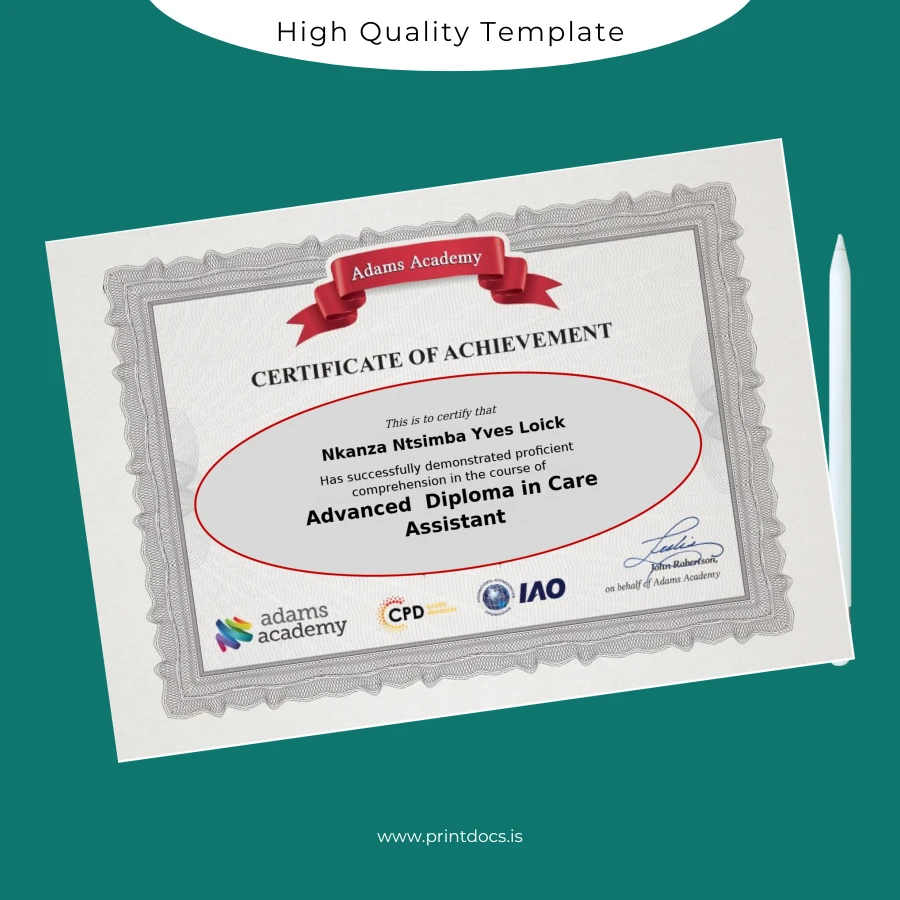 The UK Adams Academy Advanced Diploma in Care Assistant Template is an expertly designed solution tailored for professionals seeking a high-quality, editable diploma form. Whether you need a seamless replacement diploma template or a customizable degree template for documentation purposes, this digital diploma download offers precision and ease of use in one comprehensive package.
