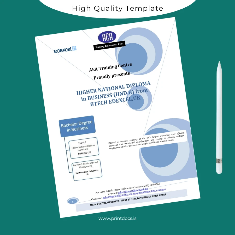 Discover the convenience of the UK AEA Training Centre Higher National Diploma in Business Template (Word & PDF), a fully editable and printable solution designed for professionals needing a quick, high-quality replacement or customizable diploma. This versatile diploma template allows seamless editing of key details, making it ideal for those who require a pristine and authentic-looking document without delay.