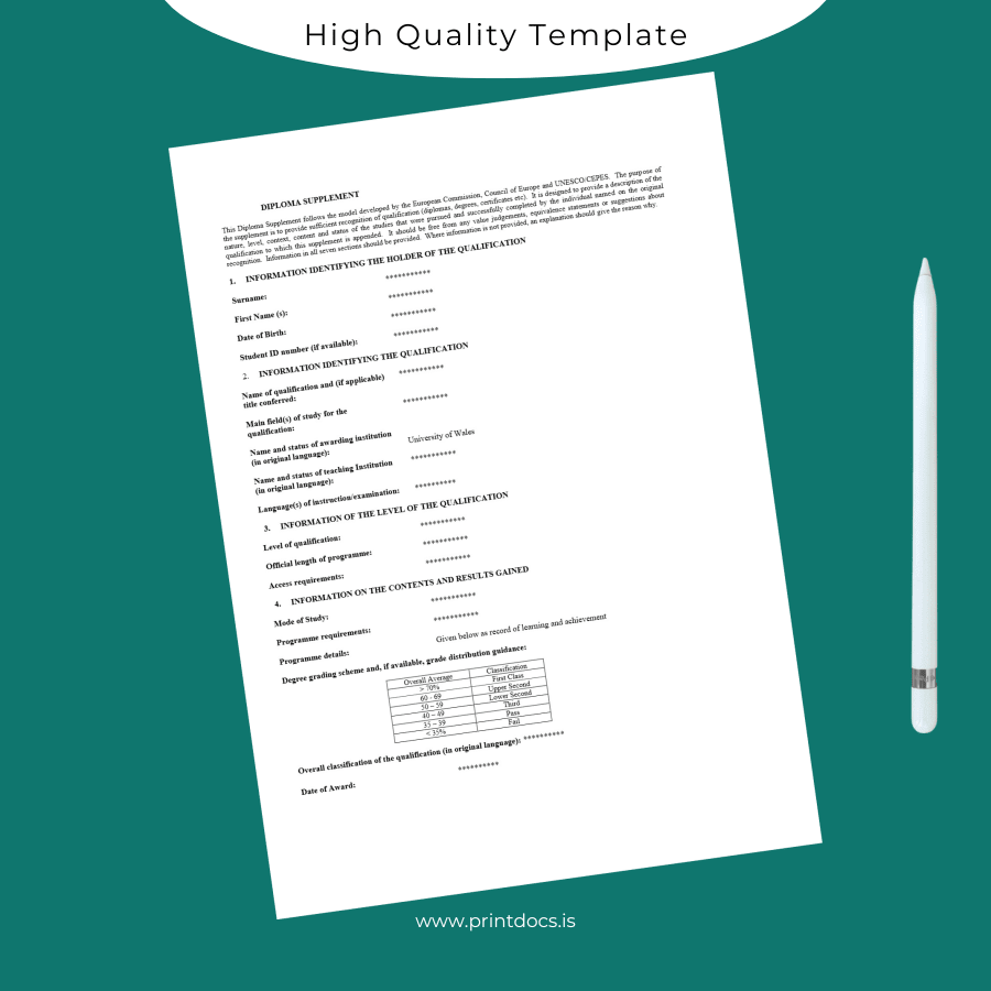 Professional and Editable UK University of Wales Diploma Supplement Template