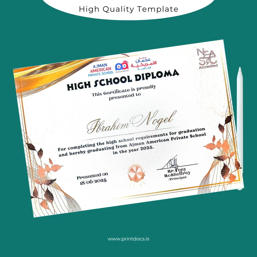 Professional and Editable Diploma Template for United Arab Emirates Ajman American Private School