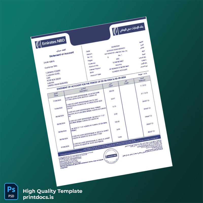 Get the United Arab Emirates Emirates NBD Bank Statement Template in Word and PDF formats. Streamline finance tracking and impress clients effortlessly!