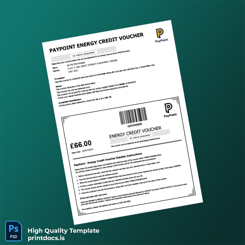 United Kingdom PayPoint Editable Energy Credit Voucher Template Overview