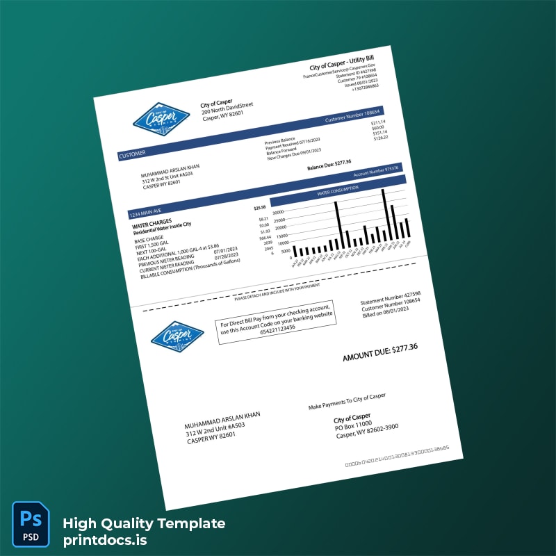 Don’t let missing paperwork slow your professional or personal processes. Download the United States City Of Casper Editable Water Bill Template today and create your own utility bill proof of address document with ease. To explore even more editable solutions, visit our extensive collection of utility bill template category products designed for verification and compliance needs worldwide.