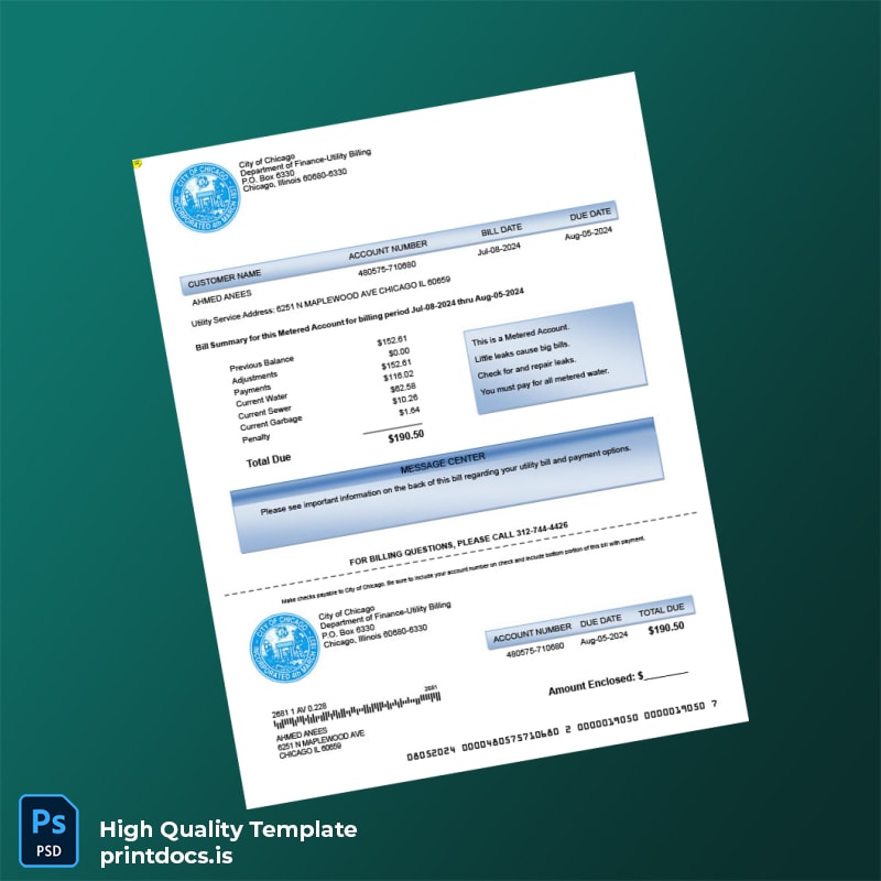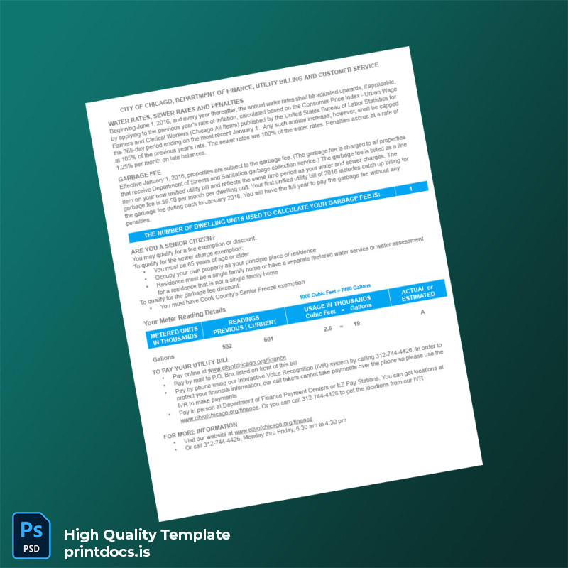 This highly customizable utility bill template provides a precise and professional solution for generating authentic-looking metered bills. Available in both Word and PDF formats, it is designed specifically for the United States City of Chicago Department of Finance utility billing, catering to professionals who need an editable and reliable utility bill proof of address template.