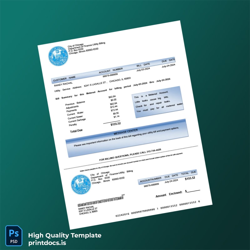 This professionally designed editable utility bill template offers a reliable and quick solution for generating legitimate-looking proof of address documents. Available in both Word and PDF formats, the Chicago Department of Finance Utility Billing Template is ideal for professionals needing a customizable, easy-to-edit water, electricity, or general utility bill for various official purposes.