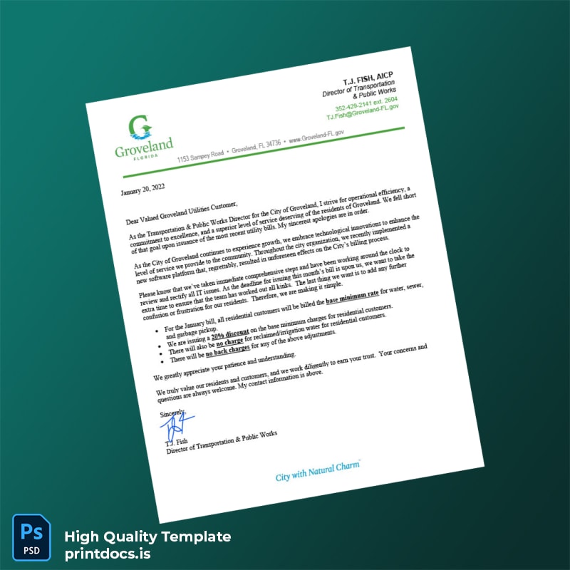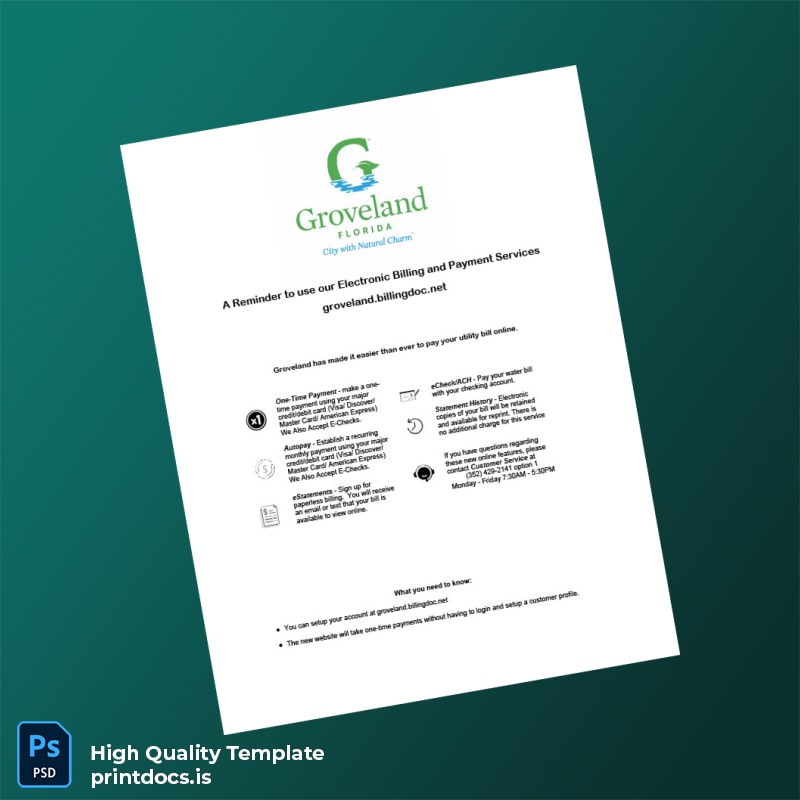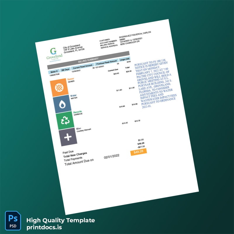 United States City Of Groveland Editable Utility Bill Template in Word and PDF Formats