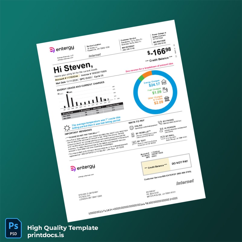 United States Entergy Arkansas LLC Editable Electricity Bill Template for Seamless Utility Verification