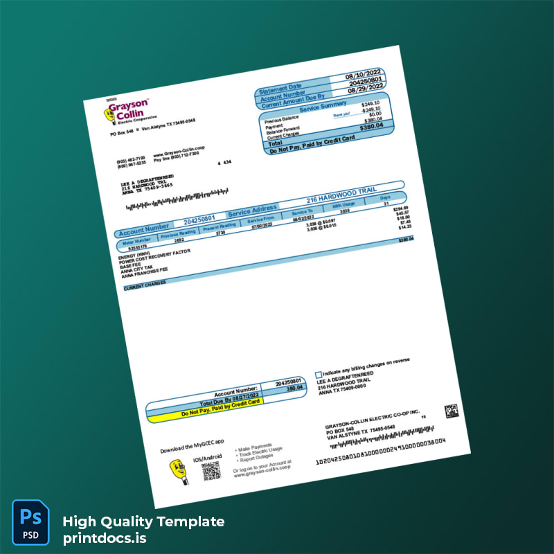 United States Grayson-Collin Electric Cooperative Editable Electricity Bill Template in Word and PDF Formats