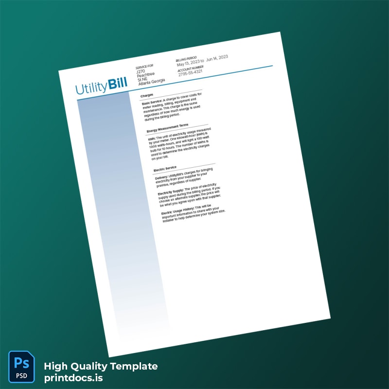 - Comprehensive template structure mimics genuine electricity bills, suitable for use as an online utility bill proof of address or a fillable utility bill template.